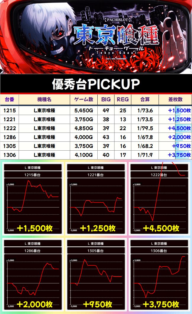 専用の告知画像、3つ並んだオススメ機種でも中央にあったりと、現在勢いありまくりの東京喰種。20台設置をキープしている、この人気機種は今後もシン・特定日では要注目機種となるのか?