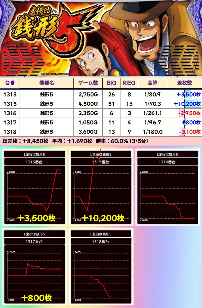 主役は銭形5 平均+1690枚