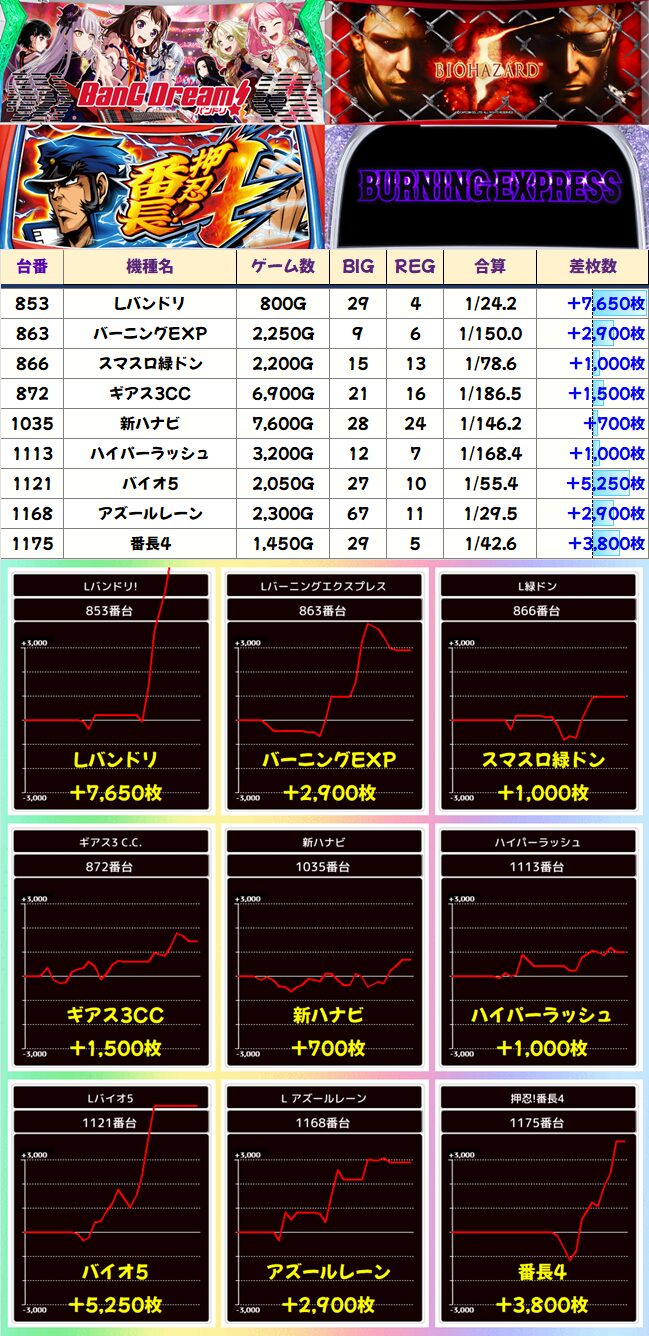 一撃性があるスマスロの中で、バーニングEXP(エクスプレス)が有利区間を切る差枚になってますね。上位をとれればコンプもみえる?