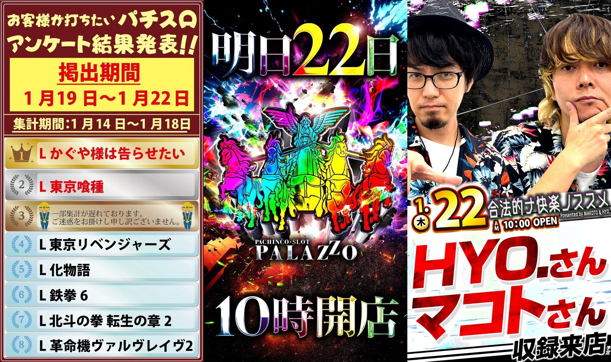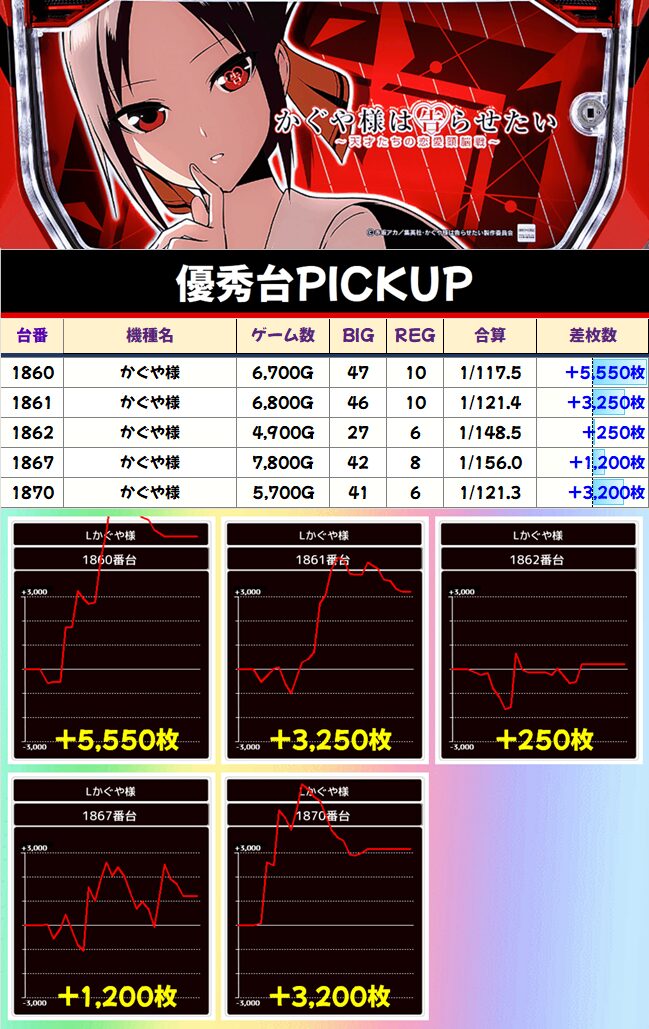 上位機種は特に強めの仕掛けの可能性があり、遅れて店内で発表される(今回だと3位)機種は特に強い可能性アリ…?なお、今回は4位と5位がかなりの結果を残している模様。