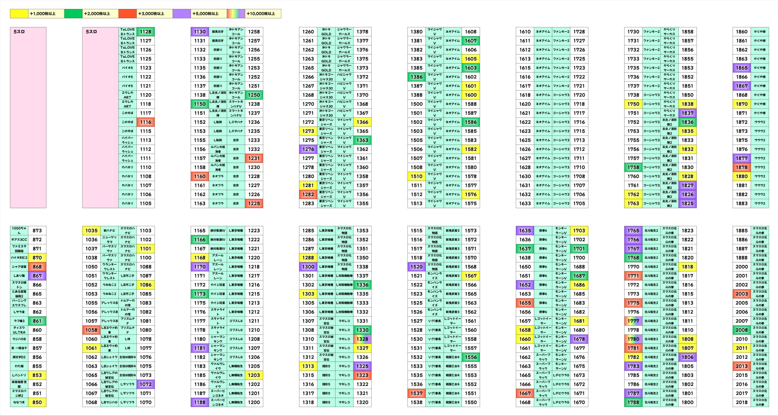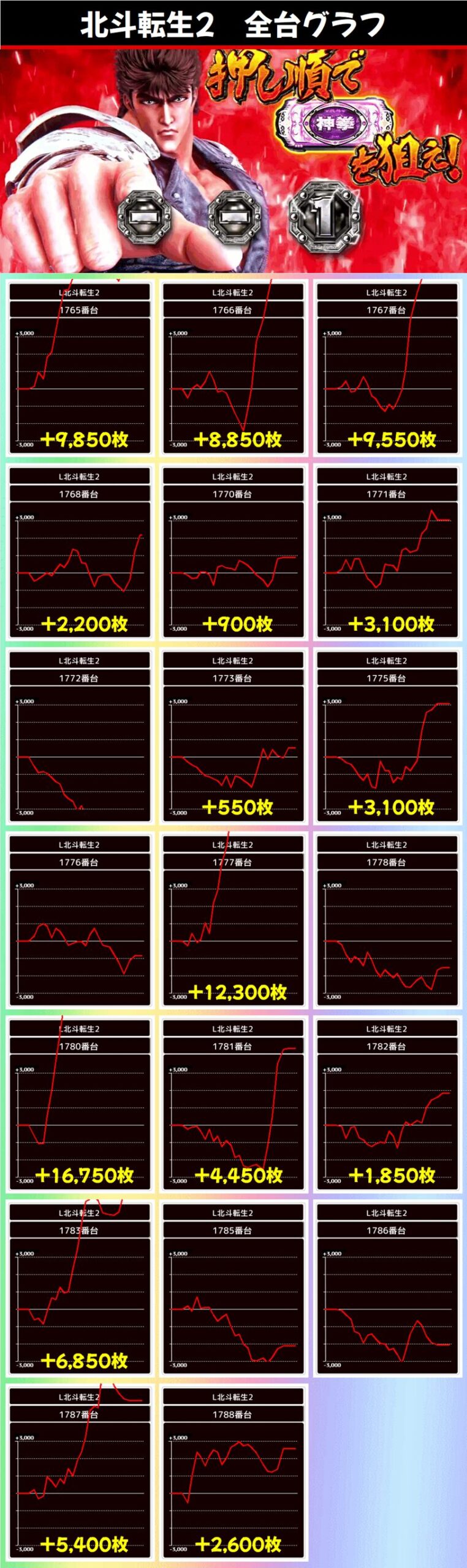 北斗転生2が7台も上位30機種に入っており、なんなら5位までほとんどが転生2。マギレコが2位に食い込んできたのはかなり健闘しています。炎炎2もしっかり3台ほど上位に入ってきてますね。30位の時点でも約5000枚なので、この日はかなり派手な出玉になったのではないでしょうか。