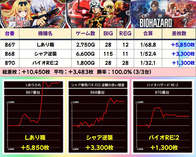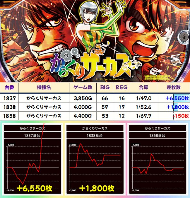 ビンゴの一撃必殺出玉が炸裂。他では新台の範馬刃牙も一撃と粘りがあり、不二子とこのすばはどちらもだいぶ安定した挙動に。