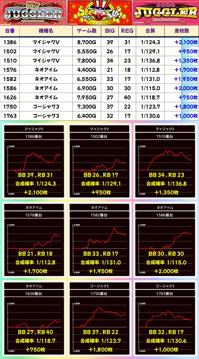 台数の多いマイジャグとネオアイムに、ゴージャグもしっかり投入してきた印象です。