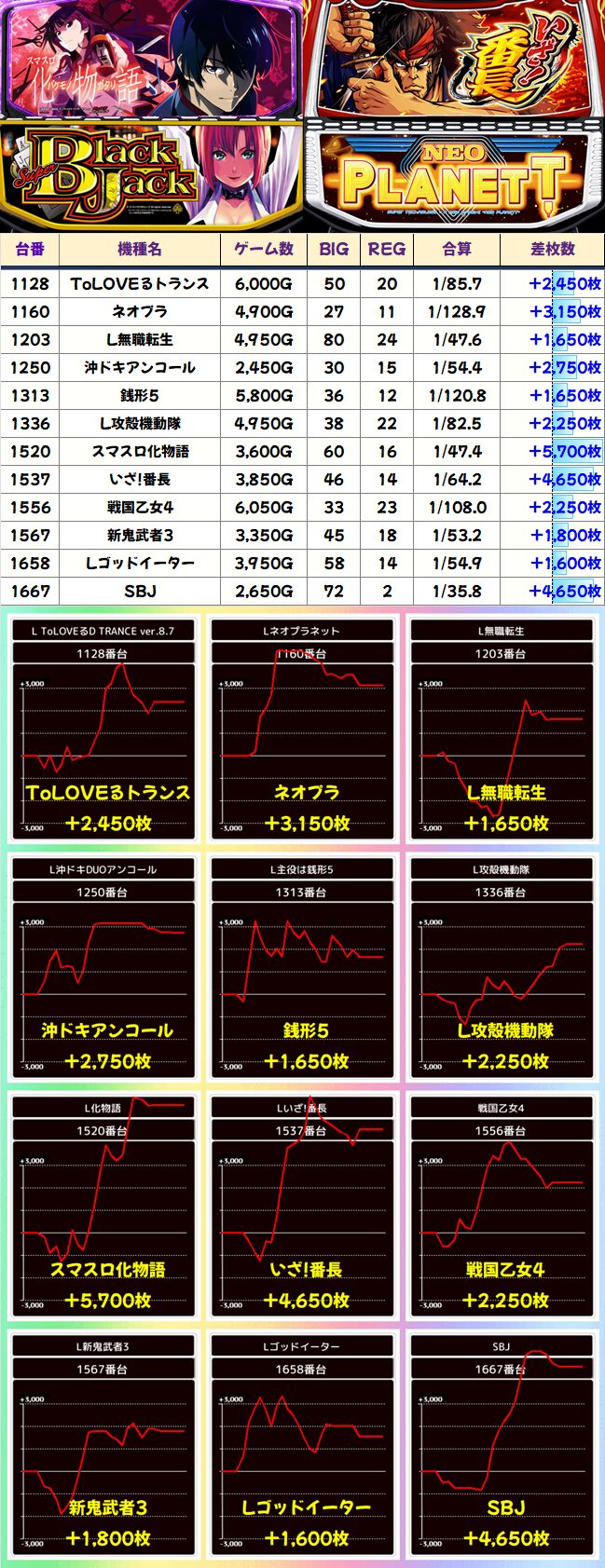 化物語、いざ!番長、SBJはいずれも中盤に大きな一撃を決めて大量出玉となりました。ネオプラもビッグバンに突入した挙動が見られます。