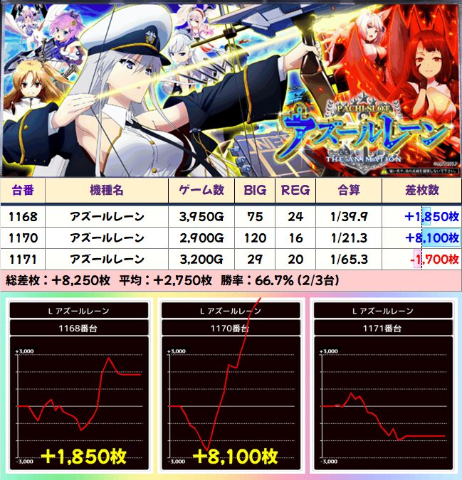 1170番台がビハインドを考えると実質万枚到達です。アズレンは3台設置でも仕掛けられる頻度が高いイメージがあります。