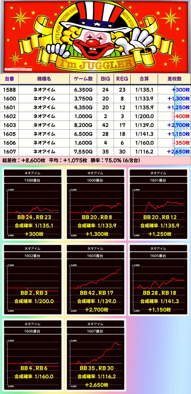 ⑧台仕掛けがあるとすればネオアイムの上記が一番怪しいです。ボーナス合算が軒並み高く、見限られた台を含めても平均枚数がかなり多い!
