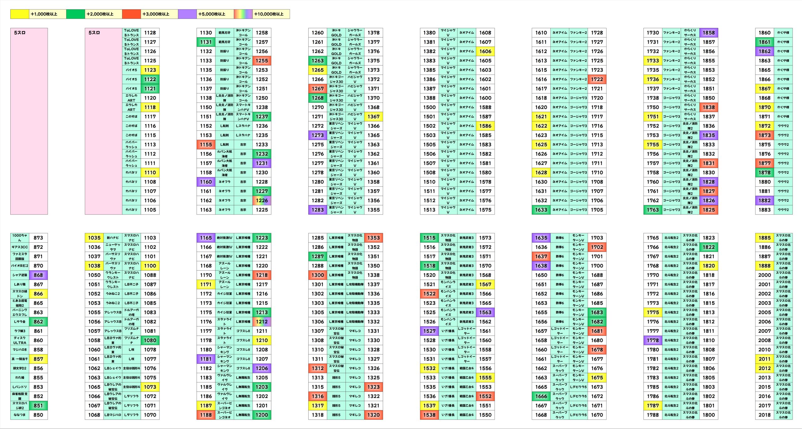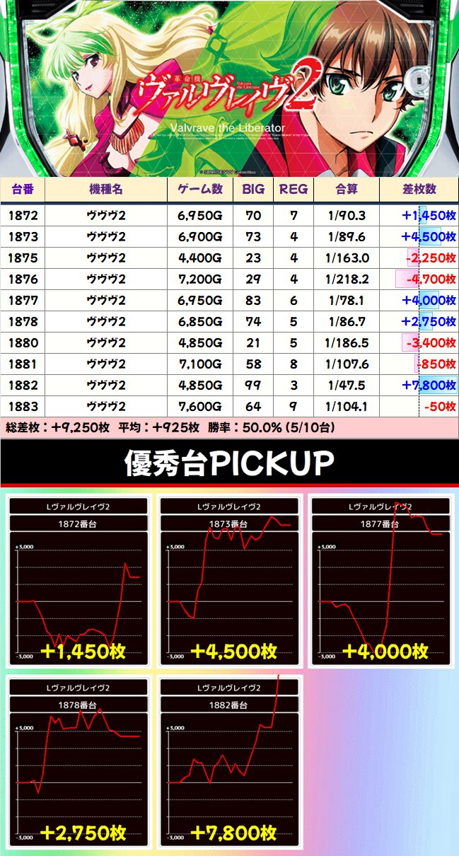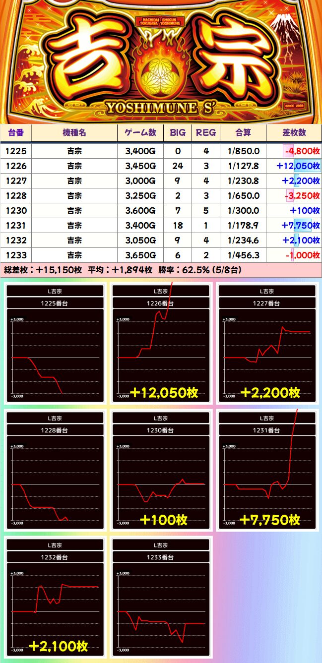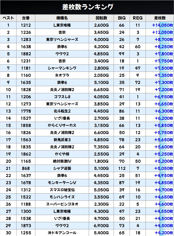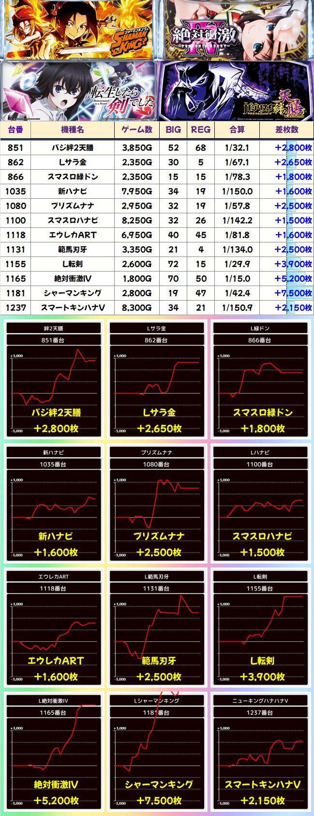 20台中9台がプラス差枚で、万枚もあります。1300番台と万枚の台は安定しているように見えますが、他は割と荒い展開に。