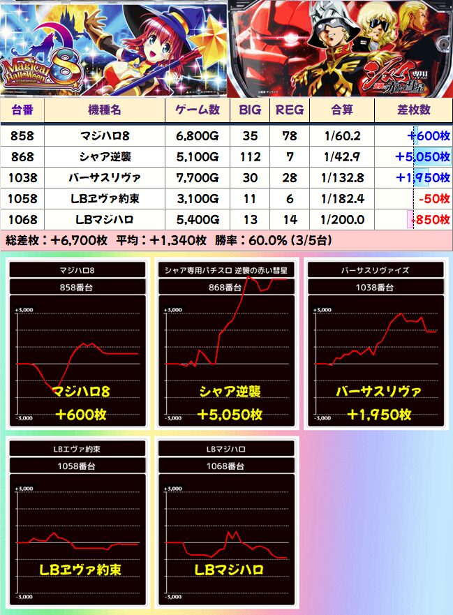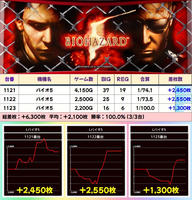 気が付けばもうすぐ導入から一年が経つバイオ5が全台プラス差枚。追う理由があったのでしょうか…?