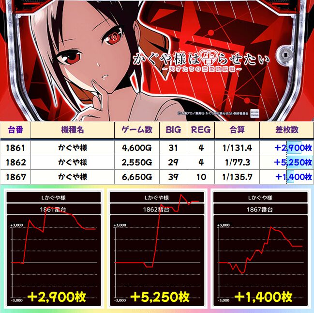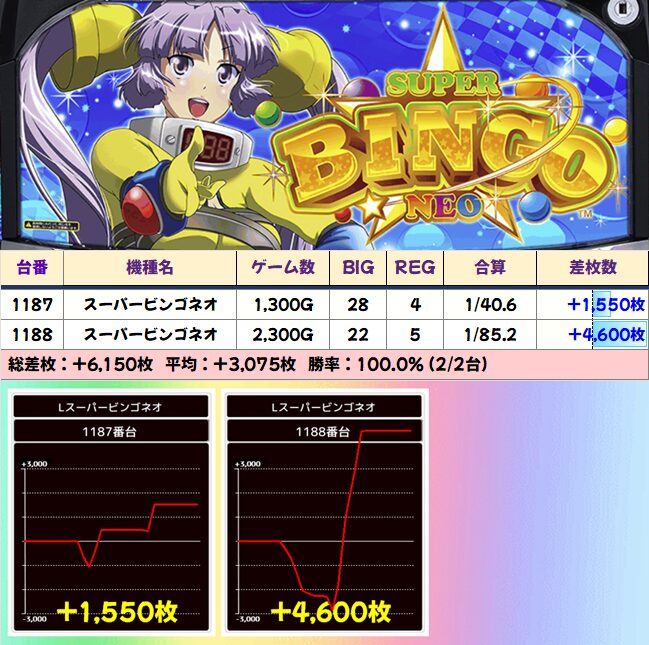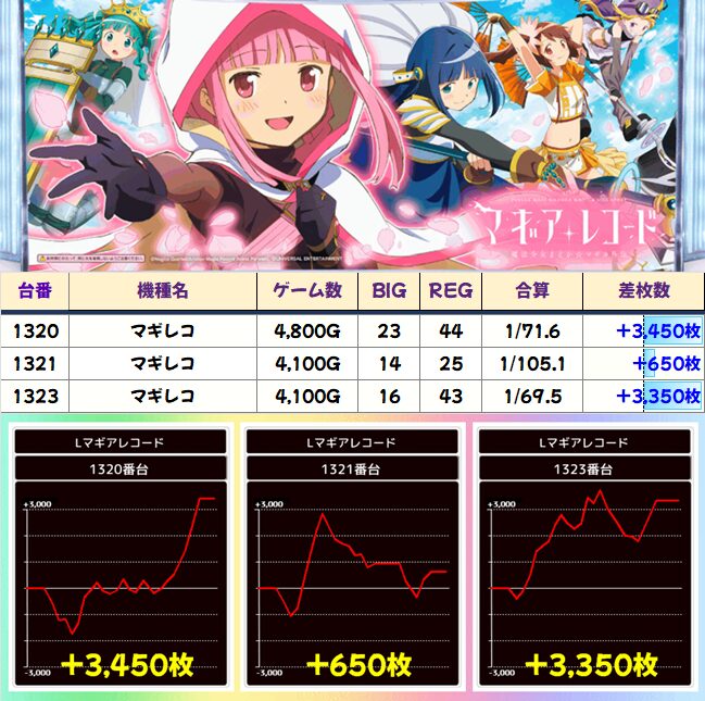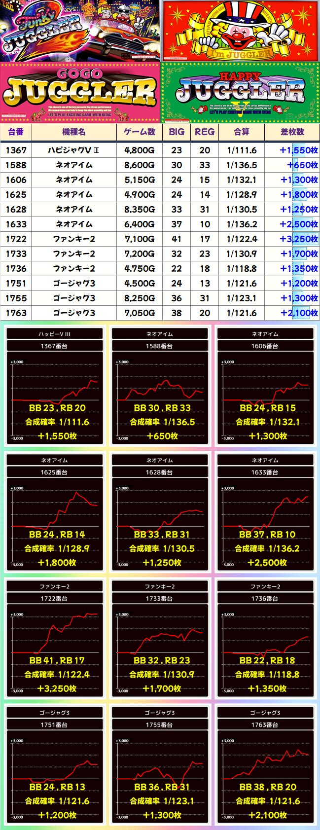 今回はファンキーとネオアイムに大量獲得のジャグあり。ゴージャグ3の1763番台も、だいぶ安定して+2000枚突破です。