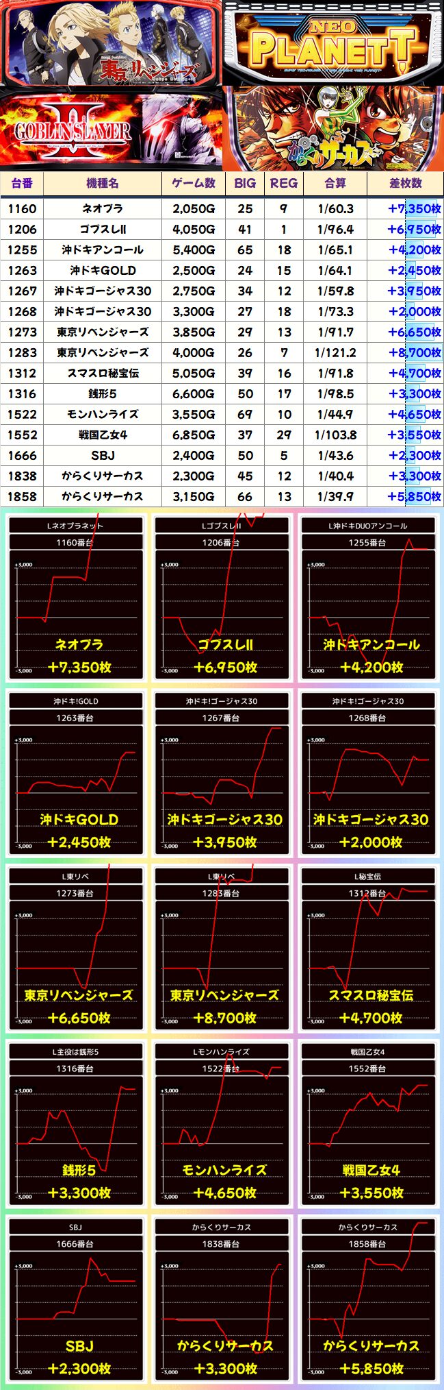 プラス差枚の台は3000G以上の稼働になってますね。挙動をみても1201番台は初当りをとれているように見えます。