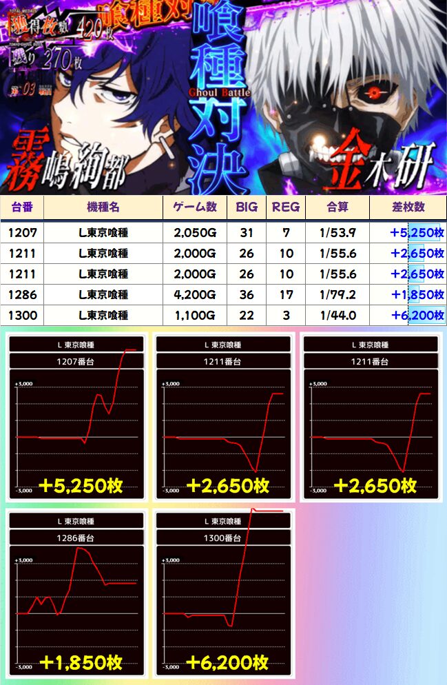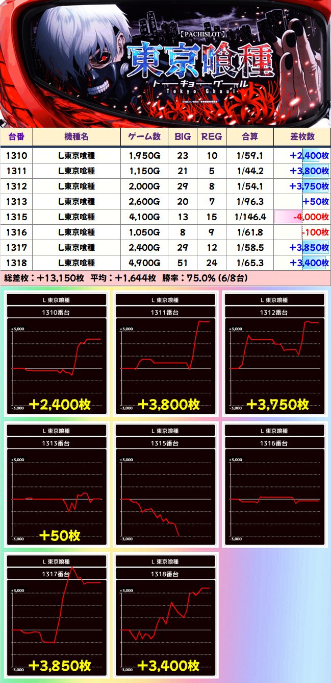 40台設置の東京喰種に8台並び仕掛けがあったと思われます。この中では特に1318番台の挙動が優秀か?