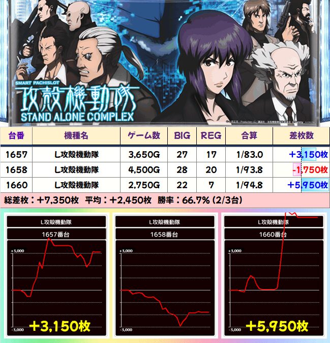 オススメのビンゴ風マスで中央にあった攻殻機動隊に良好なデータの3台あり。真ん中はREG回数が1657番台より上なのですが、電脳RUSHで厳しい展開になったか。