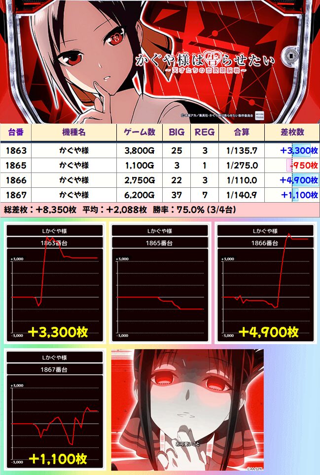 かぐや様の高設定域はどこかしらで大きな一撃(垂直にあがるグラフ)が出てきますが、ここの台周りがその挙動になっている模様。