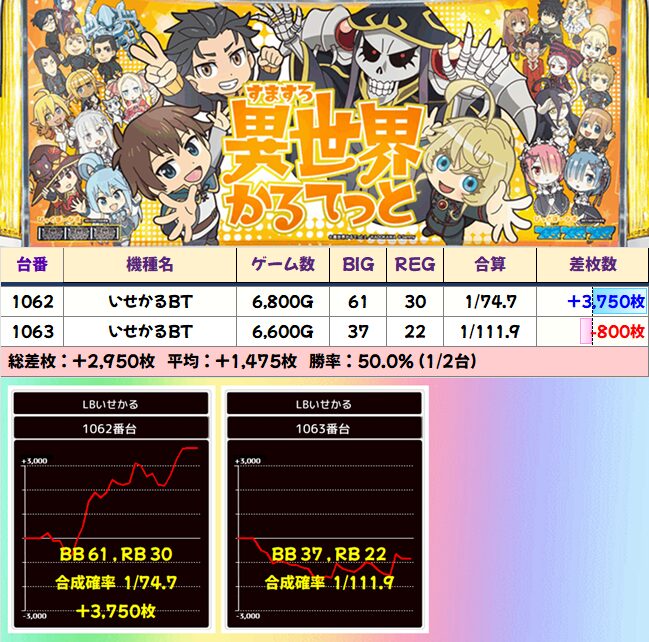 50%のヒキ次第な所もありますが、初当りチャンスとなるいせかる目と通常時ボーナスは明確な設定差があるので、やはり差が出てきます。