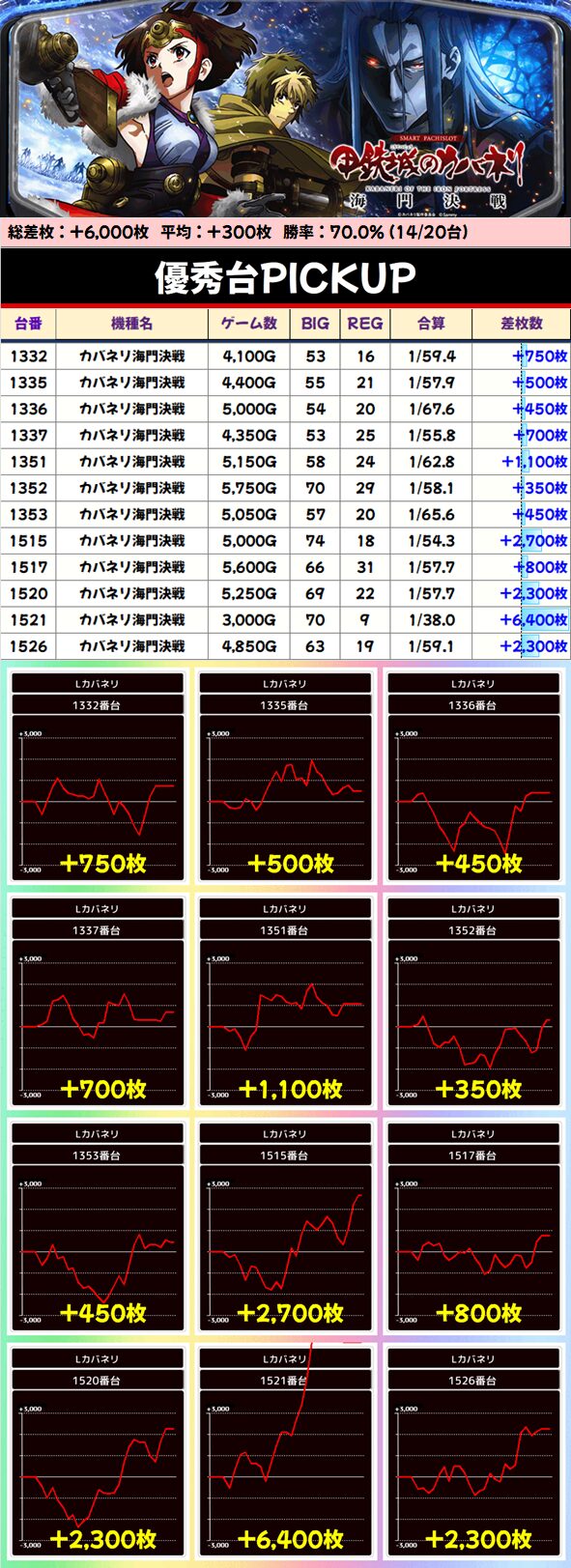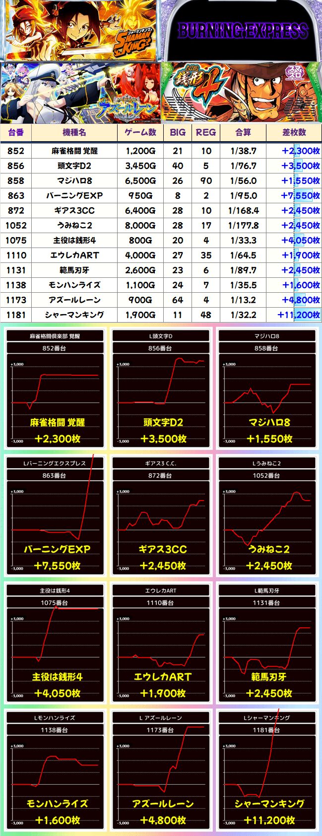 シャーマンキングがこの日TOP出玉の万枚突破。バーニングエクスプレスも上位ATで一気に出したようです。安定度でいえばうみねこが起爆すると出っぱなしになってます。