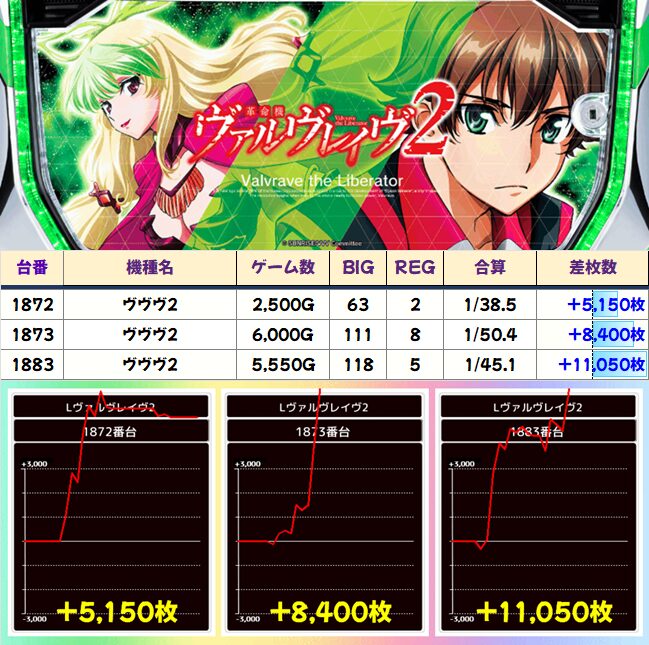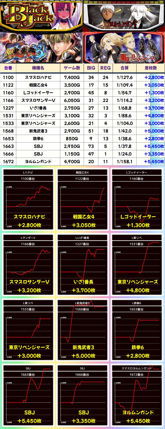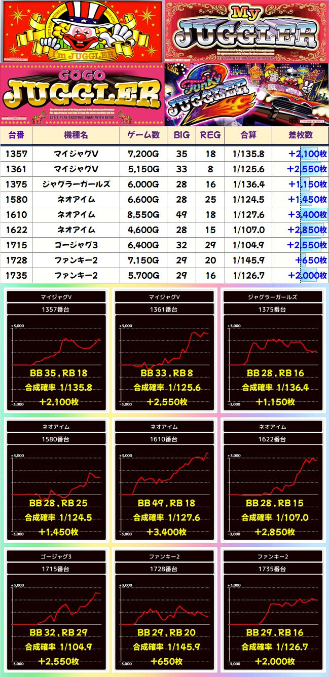 ネオアイムの1610番台が頭ひとつ抜けて3000枚を突破。REGの3倍だけBIGを引くかなりの豪腕ぶりです。