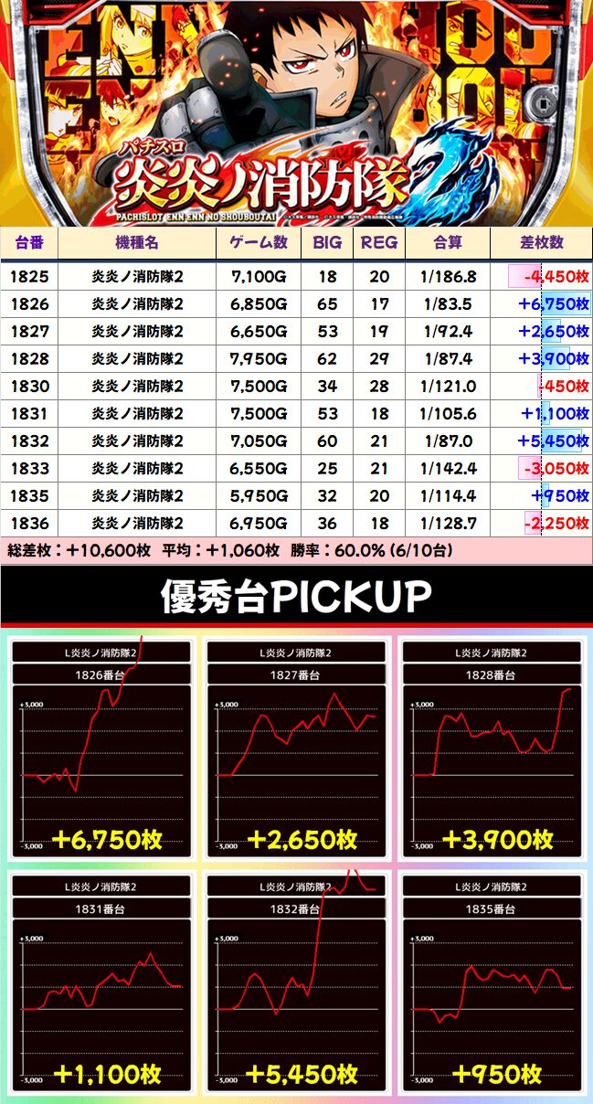全台ほぼフル稼働レベルで⑧の日定番機種である炎炎2。前回3/28はかなりのマイナス差枚でしたが、やはり不発だったようでしっかり起爆すれば強そうですね!