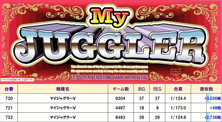 また、残りの3台並びはマイジャグVから+3026枚、モンキーから+4328枚が飛び出すなど、全台がプラス差枚!