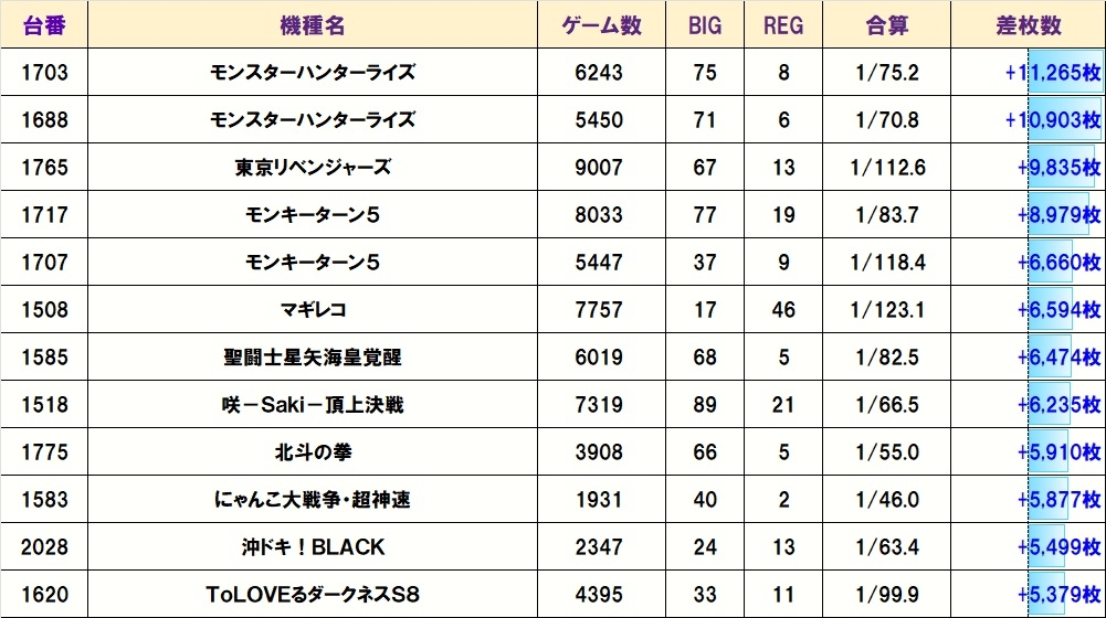 また、東京リベンジャーズから+9835枚、モンキーVから+8979枚と、あと一歩で万枚となる台も飛び出し、+5000枚オーバーが計12台!