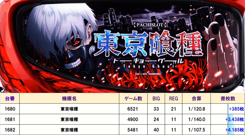 東京喰種からは+4185枚が飛び出し、3台中3台がプラス差枚の高結果!