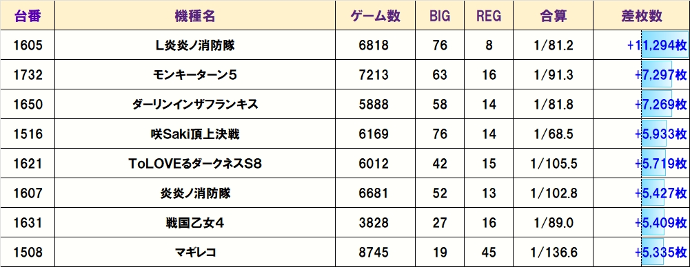 前述したL炎炎ノ消防隊の万枚オーバーをはじめ、モンキーV・ダーリンインザフランキスからは+7000枚オーバーも!