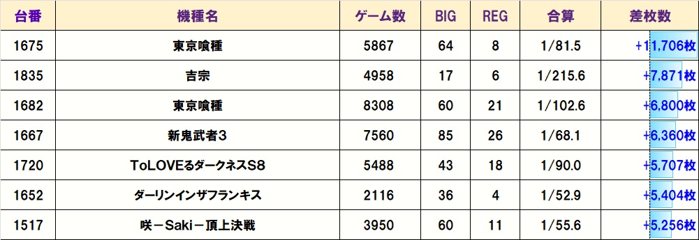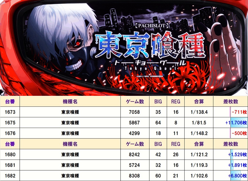 前述した東京喰種の万枚オーバーを含め、吉宗から+7871枚等、爆発台が複数!