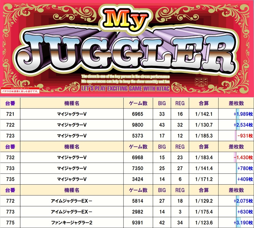 いつものように人気機種・定番機種・ジャグ系・バラエティと様々な機種で3台並びが確認できました!