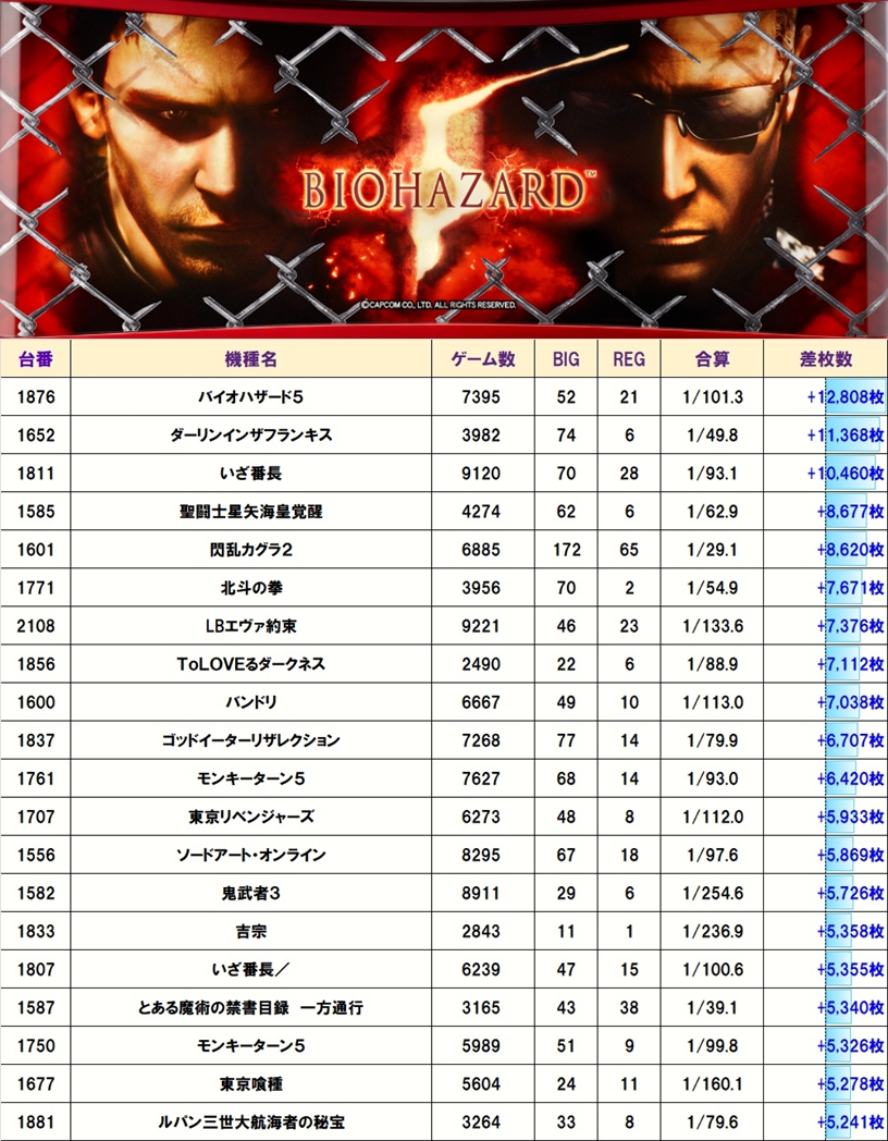 前述したいざ!番長をはじめ、バイオ5・ダリフラからも万枚オーバーと、+5000枚オーバーが計20台!