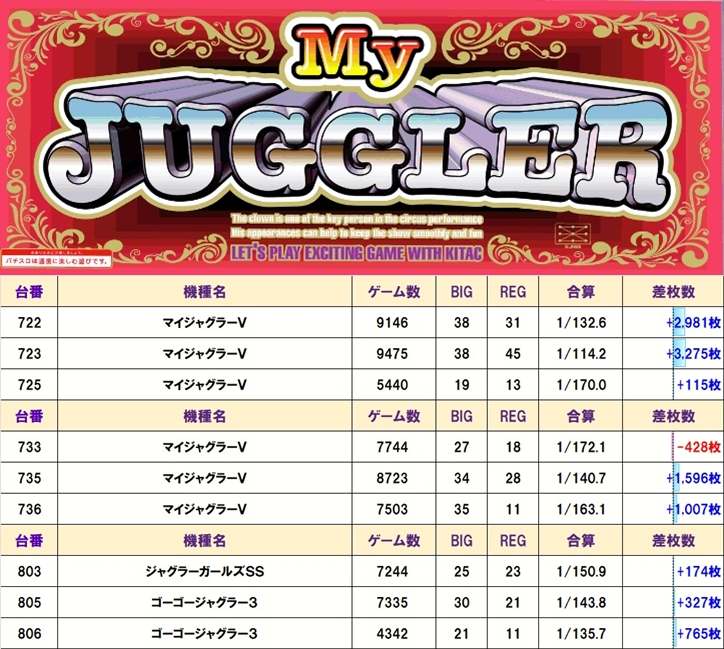 ジャグ系からは、マイジャグVから+2981枚・+3275枚の優良台が飛び出すなど、9台中8台がプラス差枚に!
