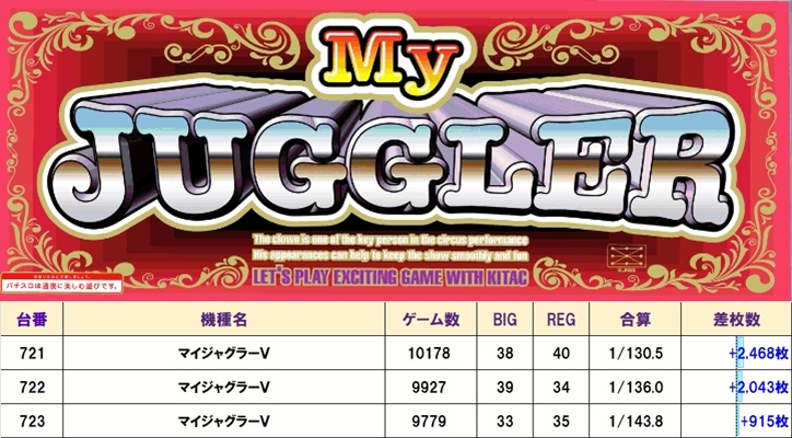 よく仕掛けが入るヱヴァ、そしてローテ中のマイジャグVは3台中3台がプラス差枚の高結果!