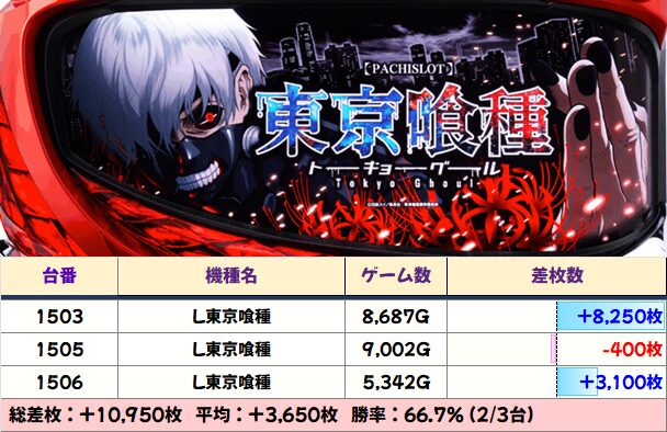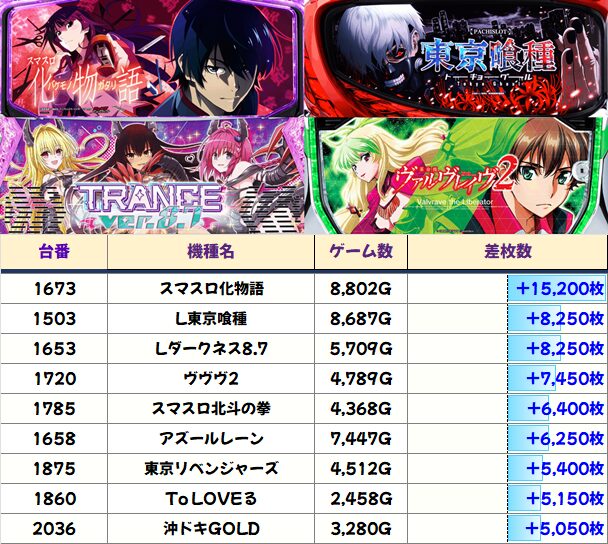今回の+5000枚オーバーは全台系で万枚が飛び出した「化物語」、並びに絡んだ「東京喰種」以外にも「ダークネス8.7」「ヴヴヴ2」「北斗の拳」「アズールレーン」などまだまだあった!