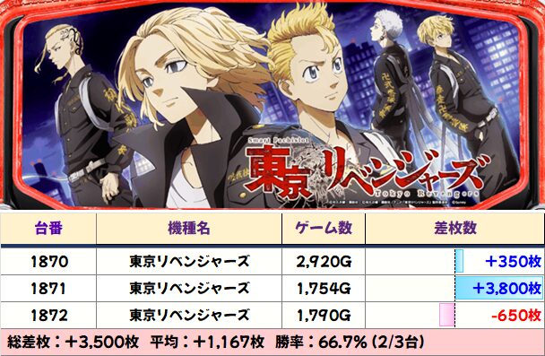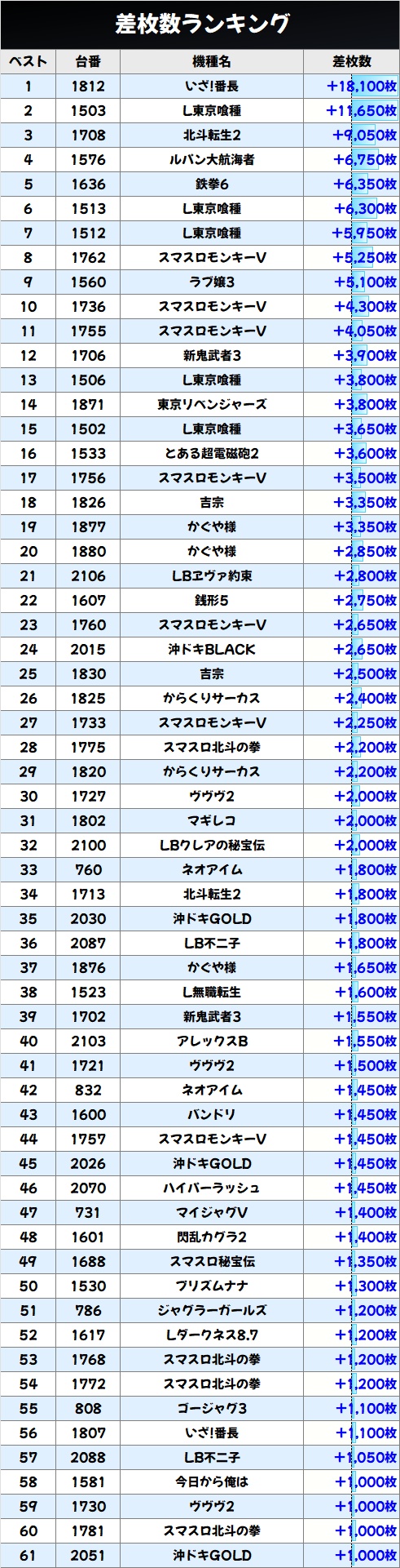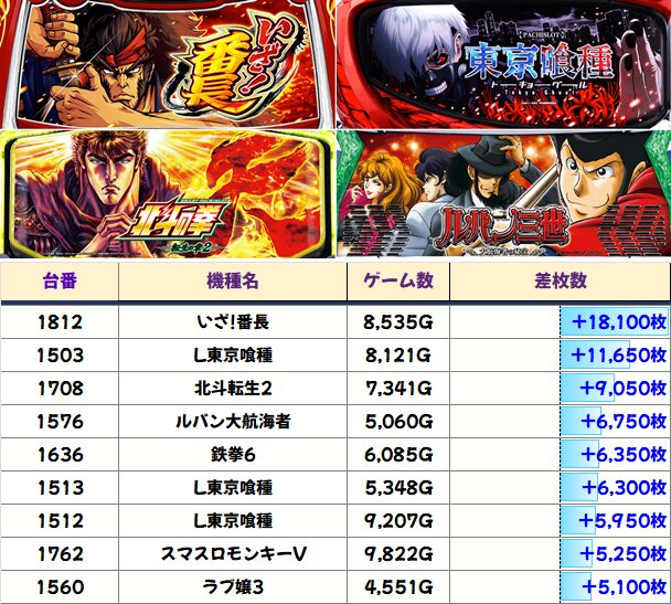 今回の+5000枚オーバーは全台系で万枚が飛び出した「いざ!番長」、同じく並びで万枚に絡んだ「東京喰種」以外にも、最新機種「北斗転生2」の+9000枚以上など優秀な単品がたっぷり!