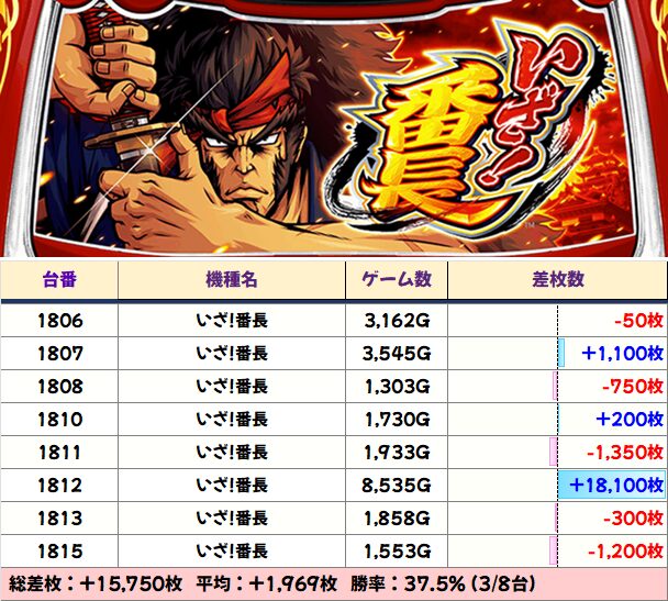 コンプ台も爆誕した「いざ!番長」が全台系濃厚に。稼働不足もありやや不発気味に…。もったいない!