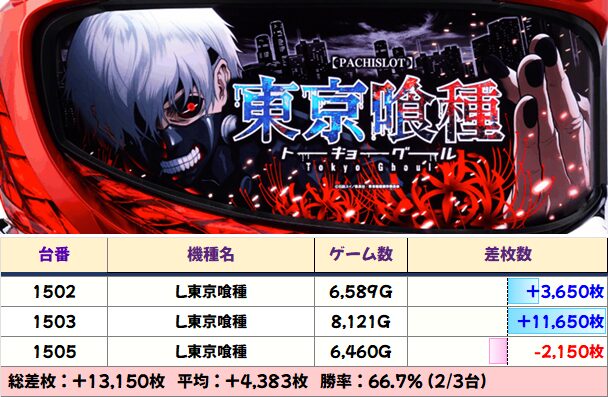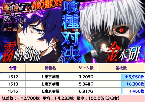 「東京喰種」には3台並びが複数ありましたが、爆裂台多数で両並びとも平均+4000枚を突破!