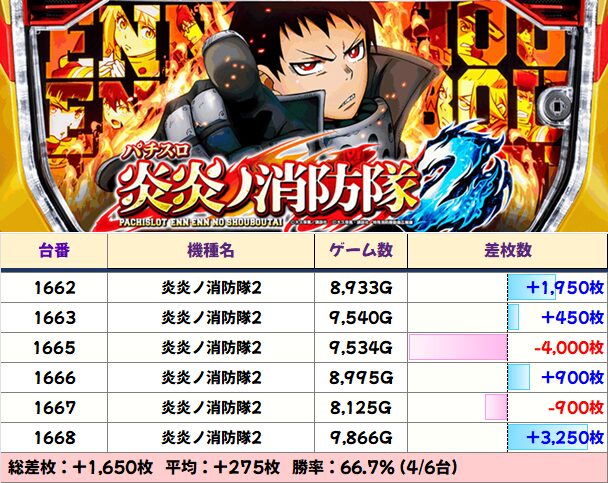 最新機種「炎炎ノ消防隊2」は+3250枚を筆頭に6台中4台がプラスに!