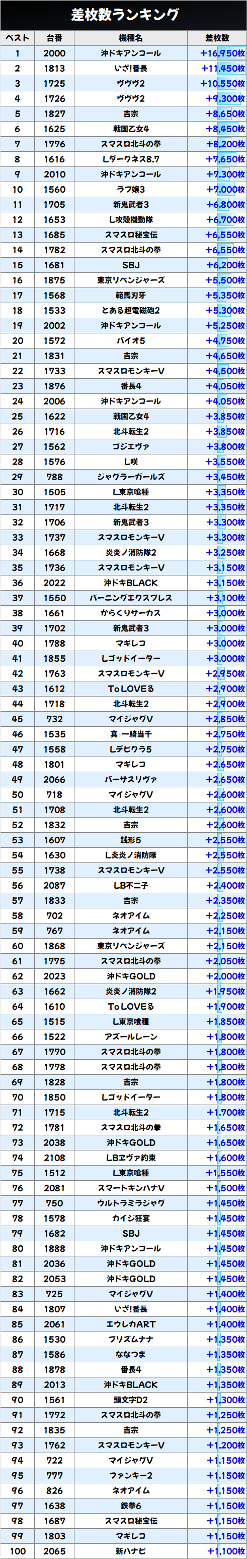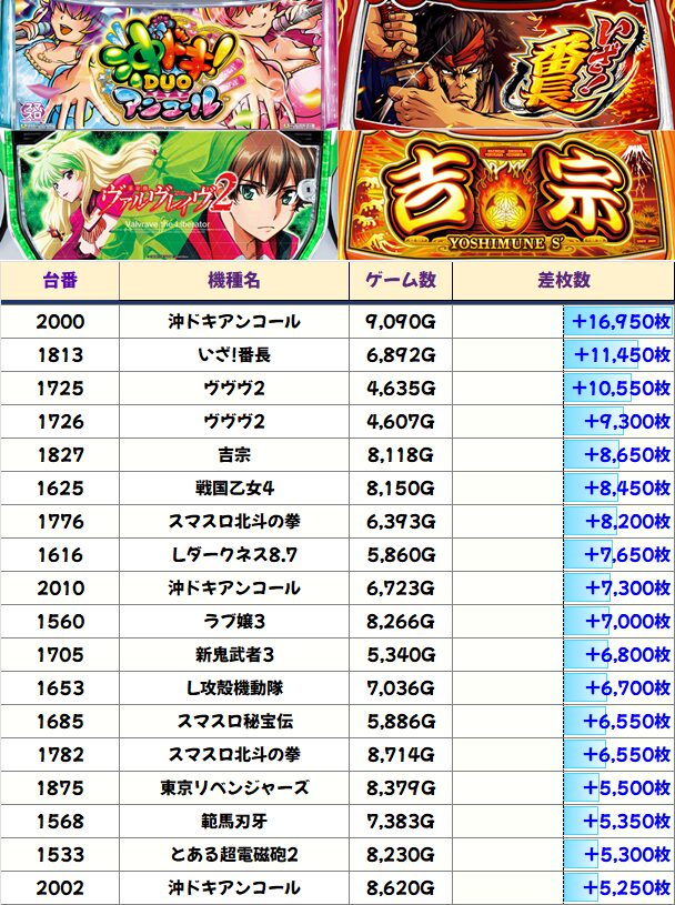 今回は「沖ドキアンコール」「いざ!番長」「ヴヴヴ2」の万枚オーバーを筆頭に+5000枚オーバーが20台近くも出現!