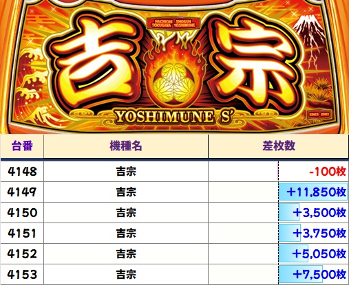 まずは【吉宗】。万枚オーバーも飛び出し大量獲得台が多数出現!吉宗は全8台設置なだけに、もしかしたら全台系だった可能性もありましたね!