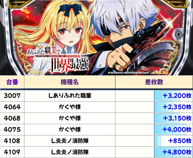 その他のSANKYO系からも【Lありふれた職業】【かぐや様】【L炎炎ノ消防隊】に単品優秀台を確認!金曜日はとにかくSANKYO AREA66に注目です!