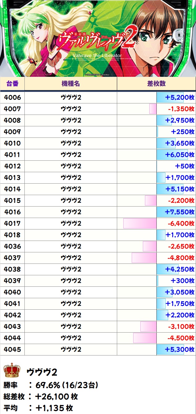 まずは【ヴヴヴ2】から!こちらは1/2仕掛けとなっており、平均も+1135枚と好結果に!大量獲得台が多数出現していました!