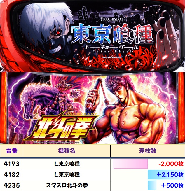 そしてマイジャグからは3台並び×3か所、お馴染みの東京喰種&スマスロ北斗の拳のカド台仕掛けも!喰種は1/2・北斗は1/4でカド台が当たりでしたね!