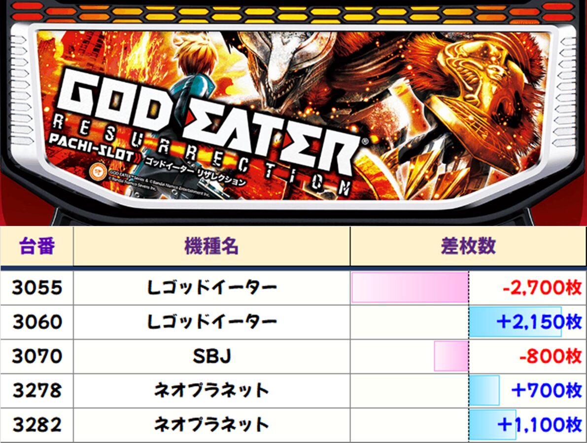 4133番台は万枚overの大量出玉を獲得。その他、高差枚の台が目立つ結果となりました。