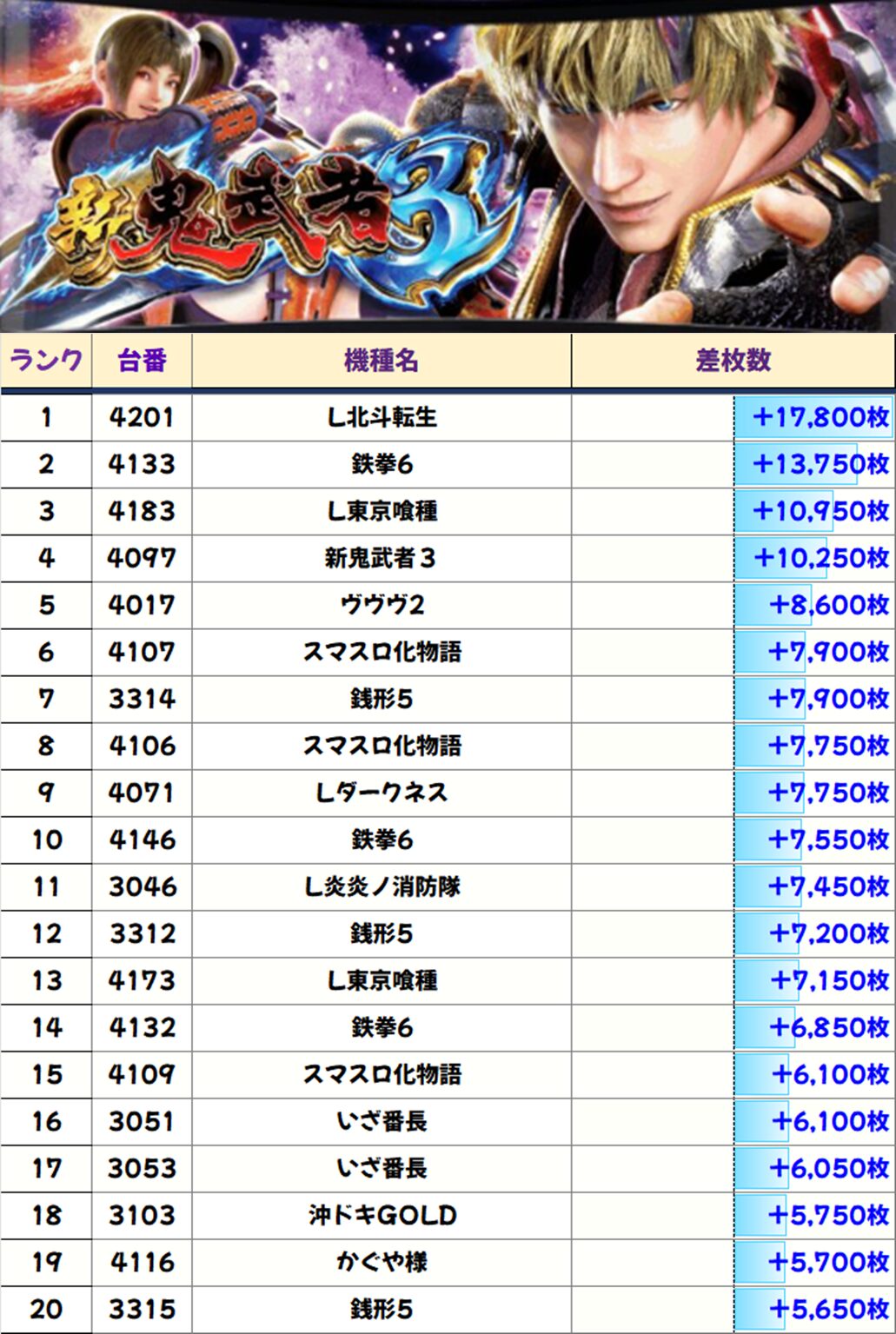 TOP20は+5,000枚以上に加え、万枚オーバーは4台出現!