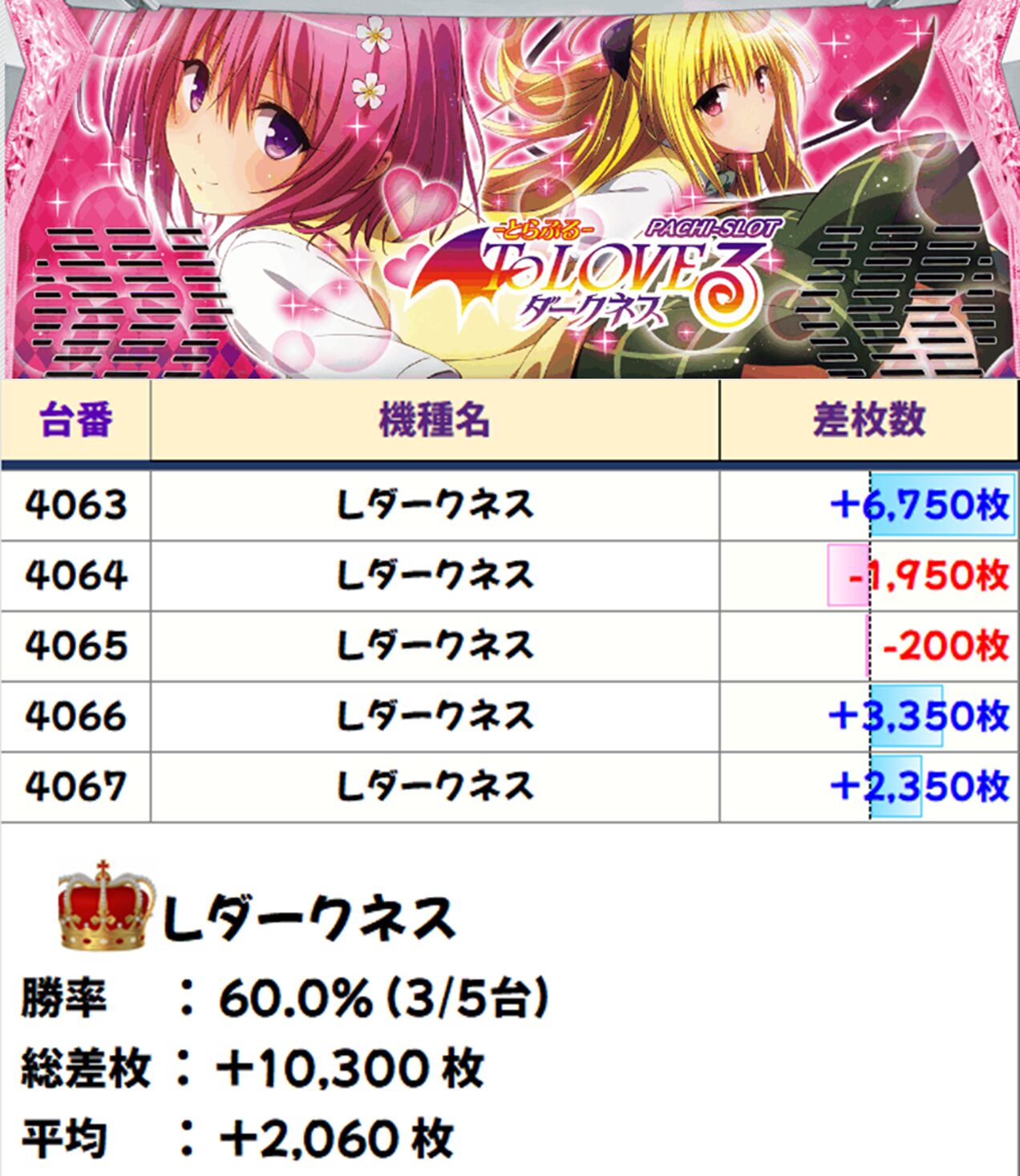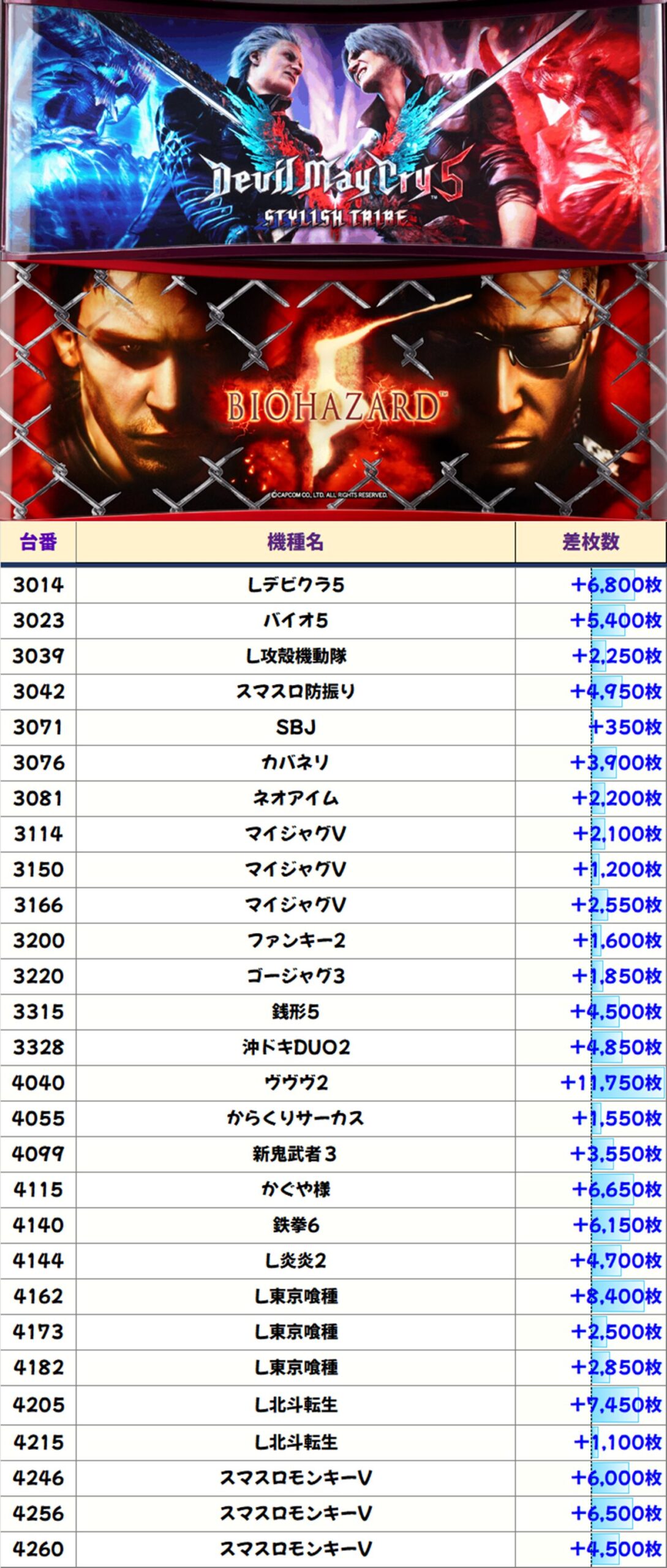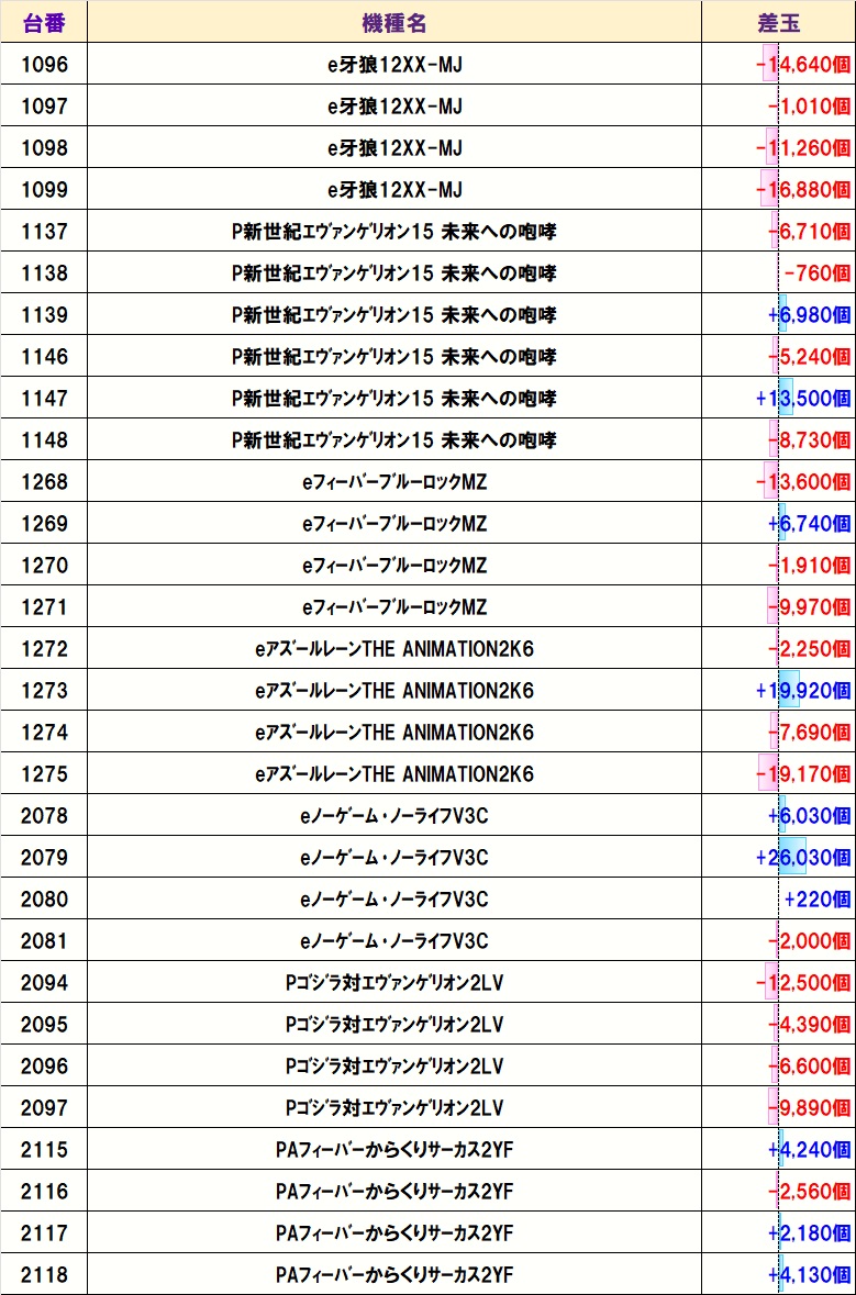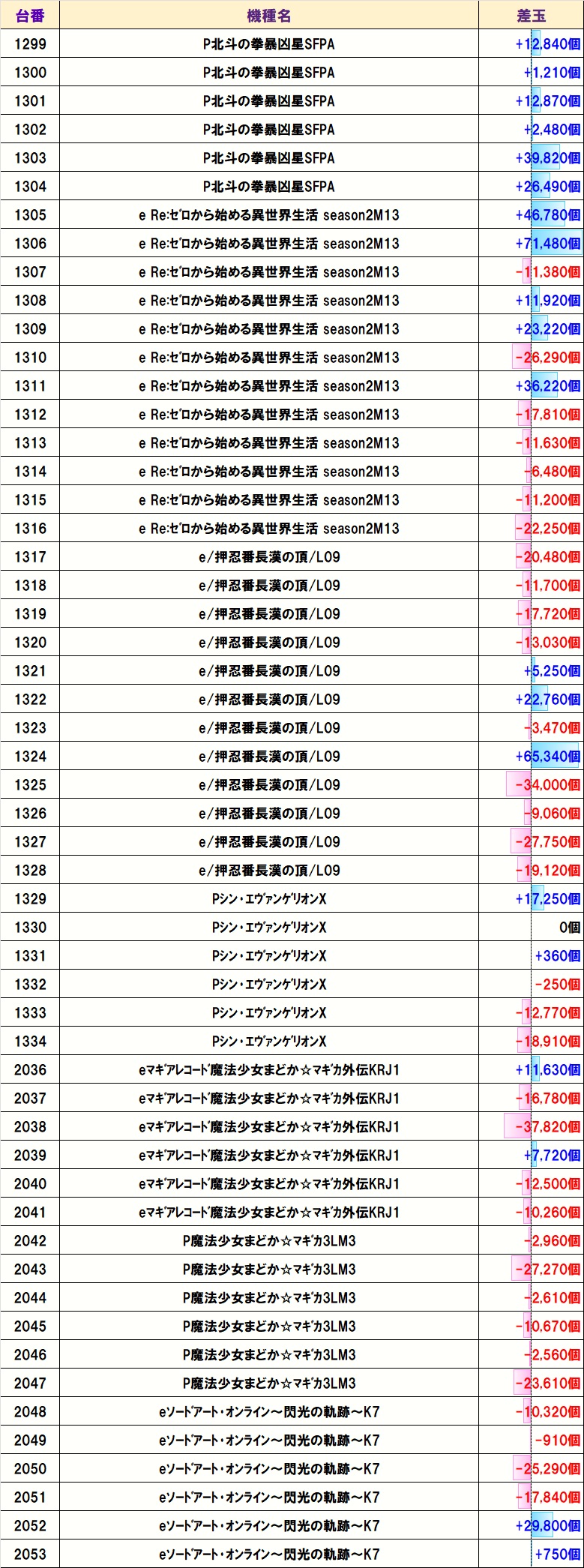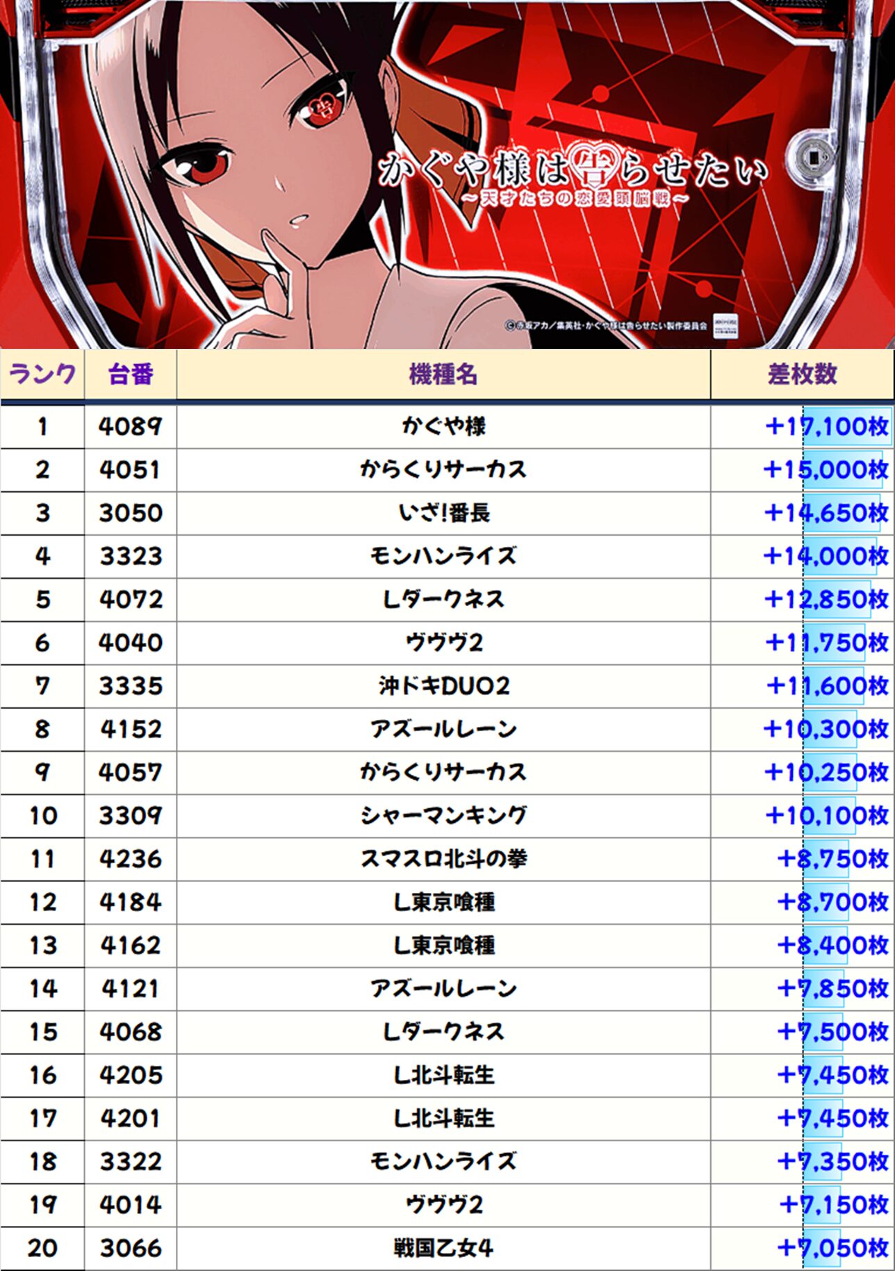 TOP20以上は+7,000枚overと大量出玉の台も多数確認。