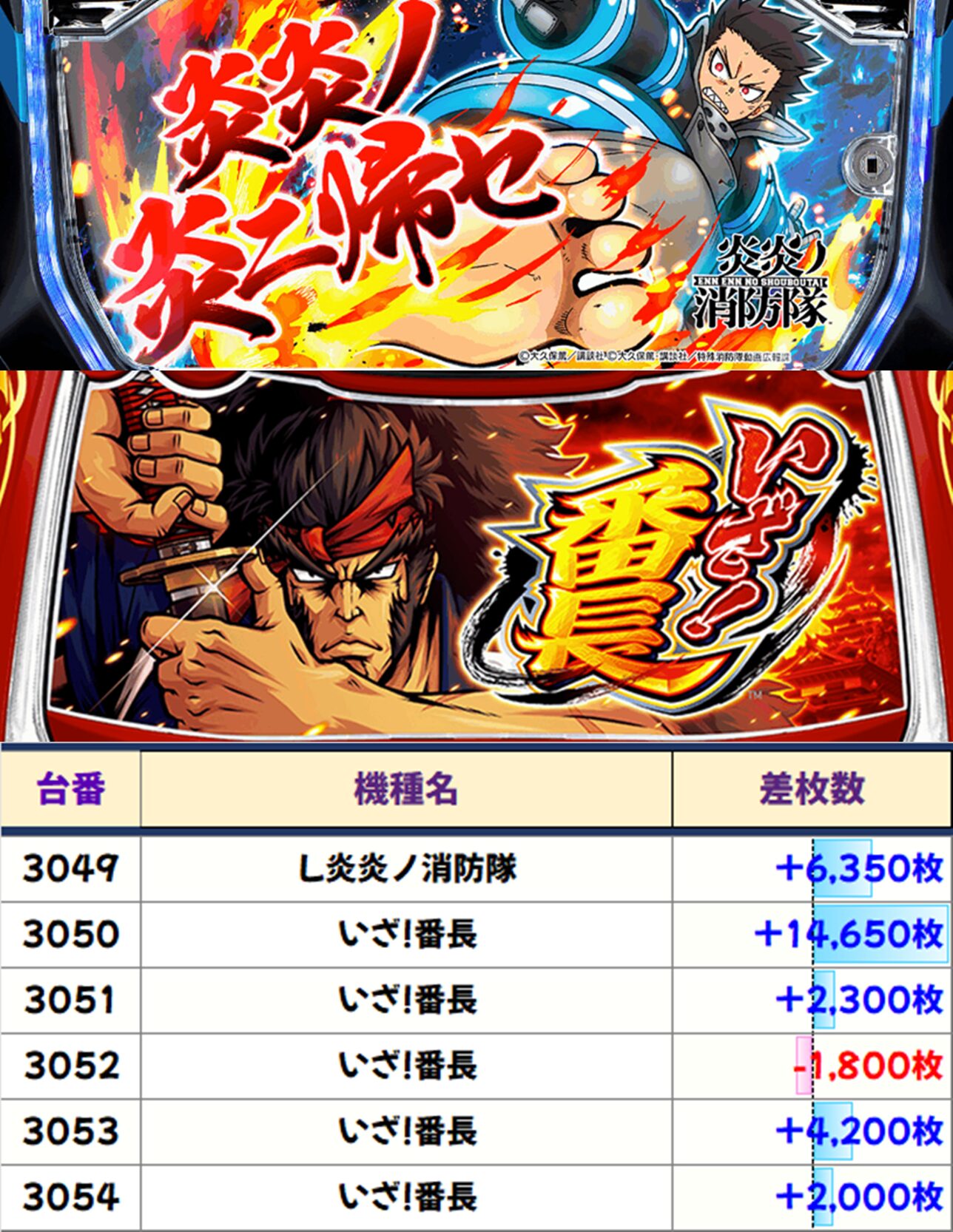 【並び仕掛け①】L炎炎-いざ!番長(3049-3054番台)【平均+4,616枚】