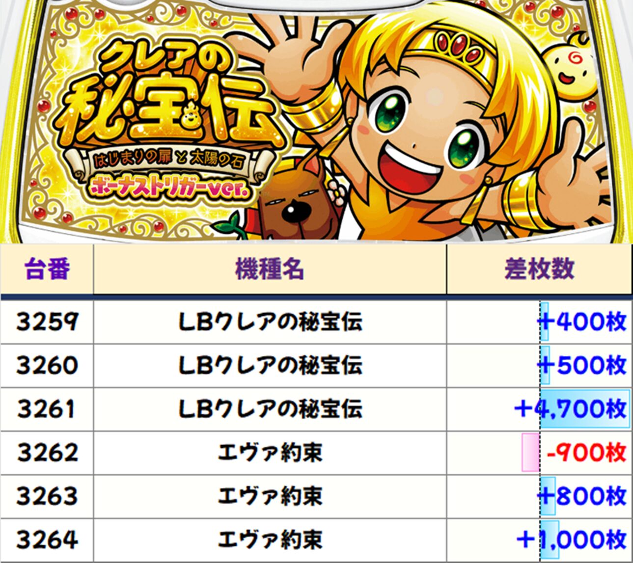【並び仕掛け③】クレアBT-エヴァ約束(3259-3264台)【平均+1,083枚】