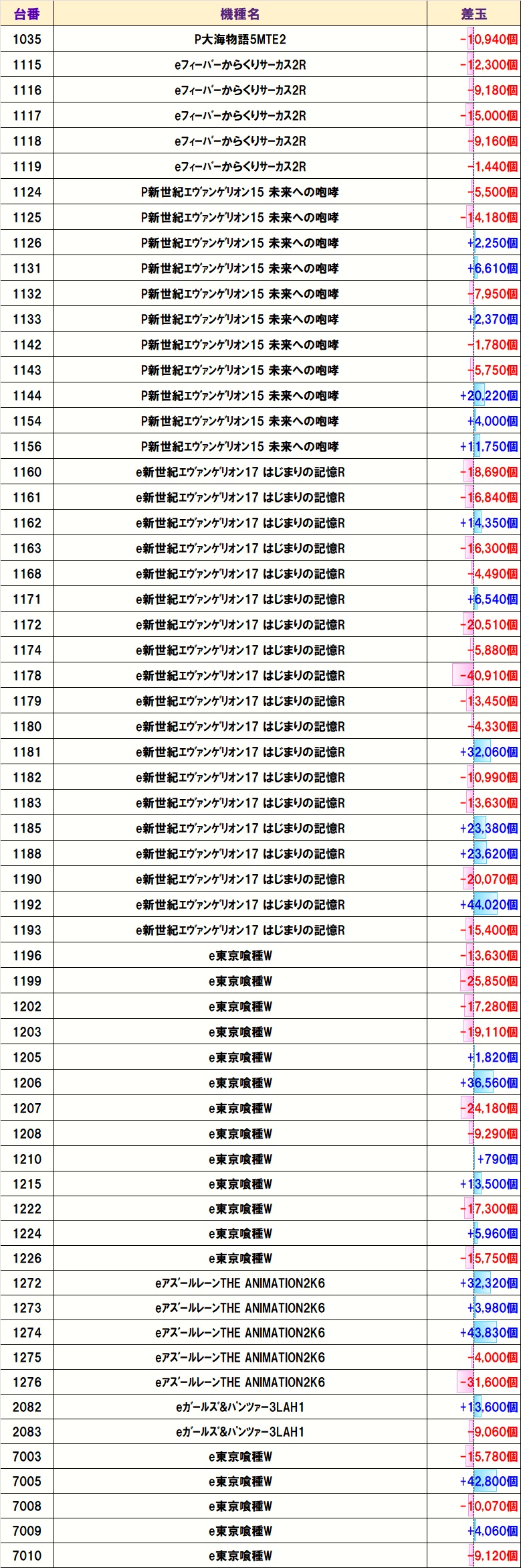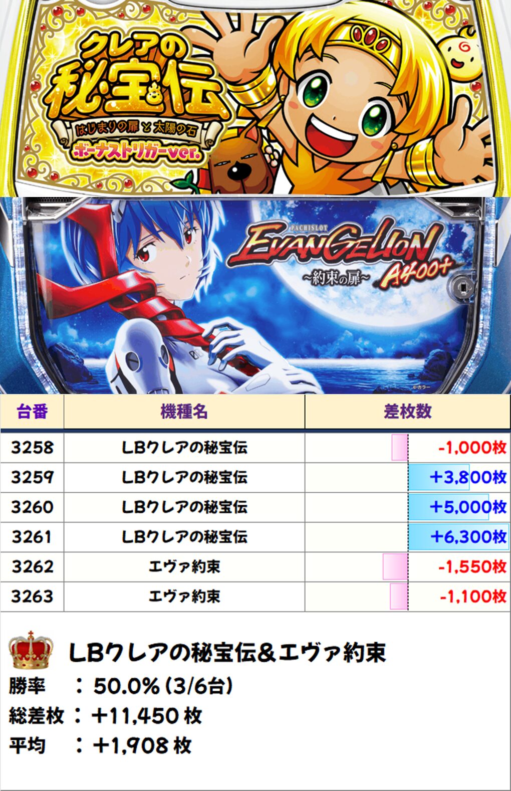 クレアは大量出玉が多数。エヴァは惜しくもマイナスですが、全台8000回転以上のぶん回し!