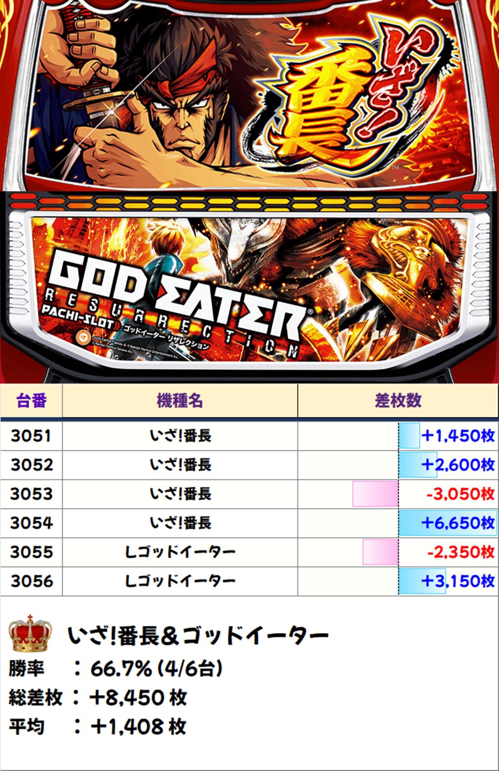 【6台並び②】いざ番長&ゴッドイーター(3051-3056番台)【平均+1,408枚】