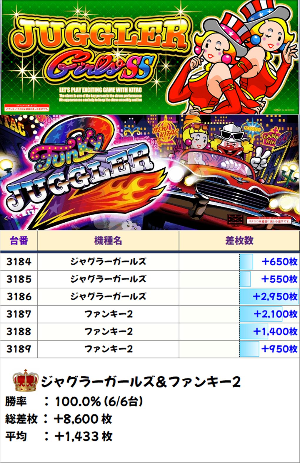 【6台並び⑩】ジャグガ&ファンキー2(3184-3189番台)【平均+1,433枚】