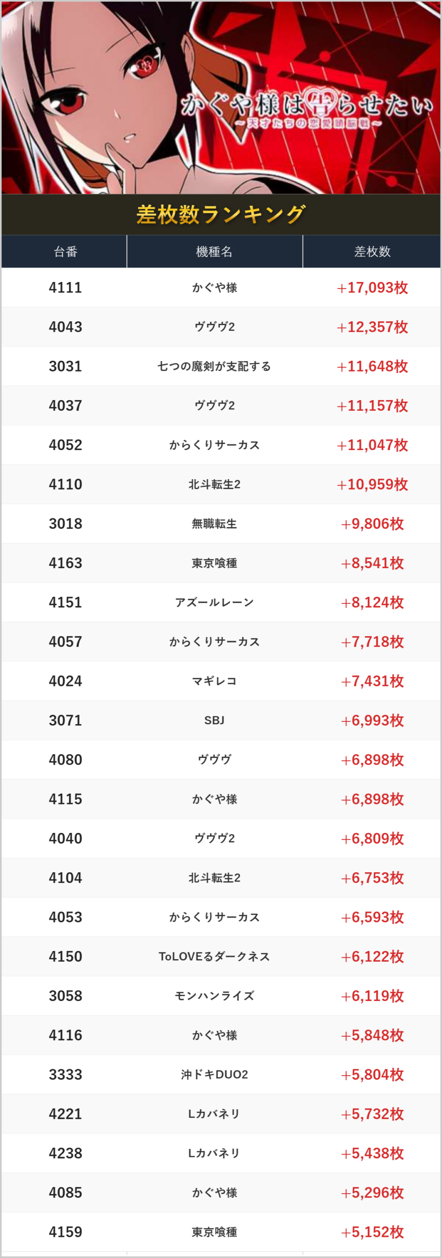 店内差枚数ランキング!
