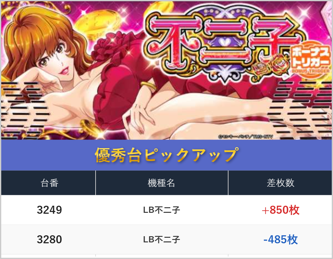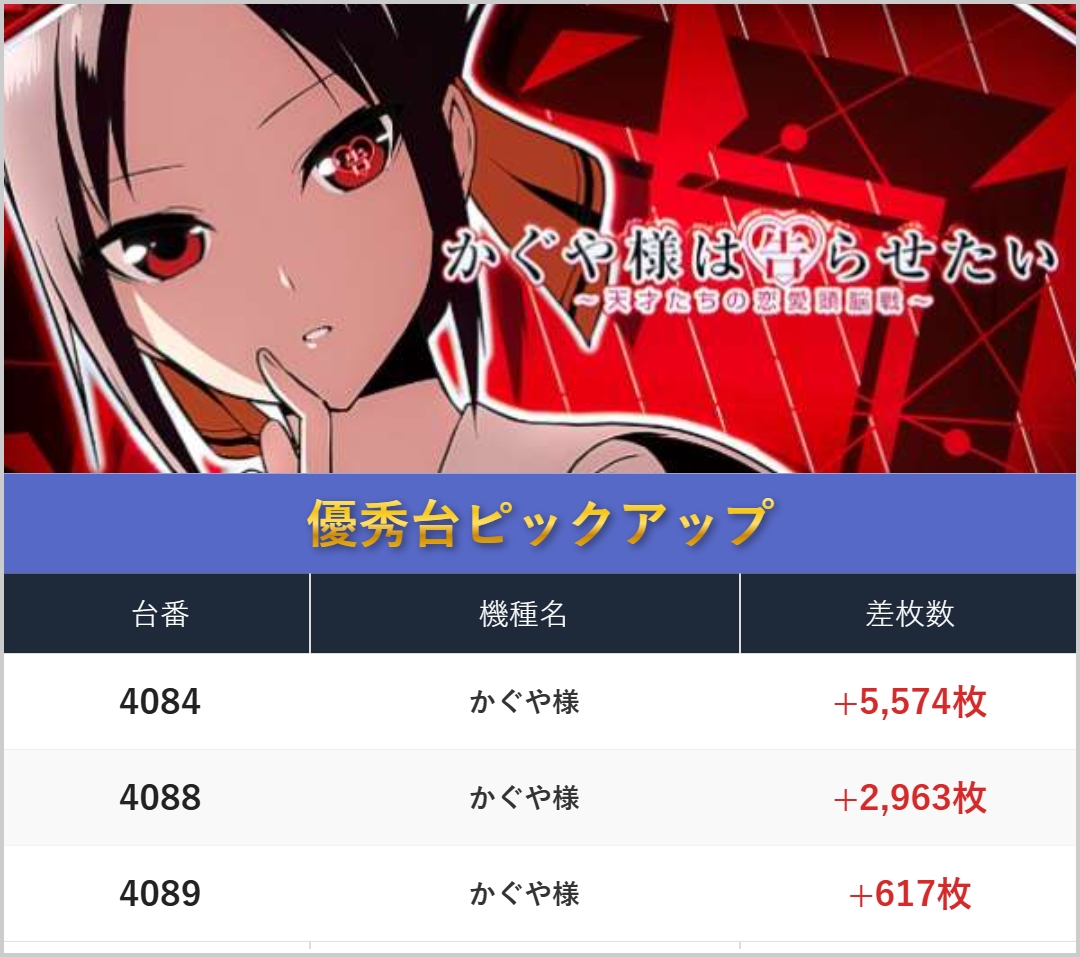 その他、同メーカー機種【かぐや様】【炎炎2】にもしっかりと優秀台を確認。